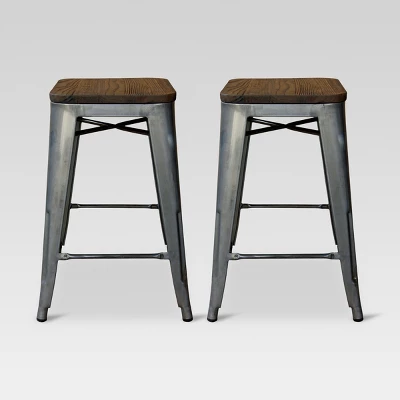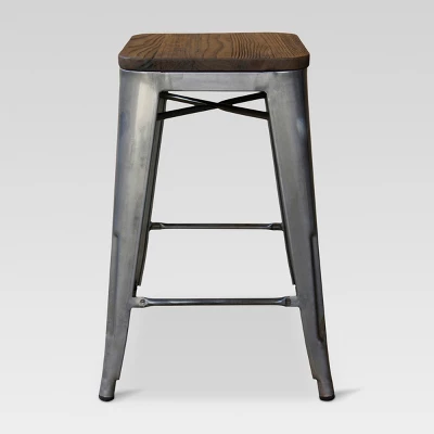 Streamlined and chic, the Threshold™ Hampden Industrial 24″ Counter Stool with Wood Top is a hot addition to your modern loft apartment or home. This counter-height furniture set is the epitome of industrial cool with unique metal legs that subtly swoop out at the base and polished hardwood seats for a touch of rustic design. A hip addition to your kitchen island, counter or table, these stools are a design aficionado’s dream come true.